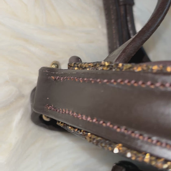 Dieses Unikat verbindet tiefdunkles, geschmeidiges Leder mit einer luxuriösen Glitzerveredelung in warmen Gold- und Champagnertönen. Der Nasenriemen wurde in sorgfältiger Handarbeit mit einer dichten Crystal Rocks -Line versehen – fein, präzise gesetzt und farblich perfekt abgestimmt auf das satte Braun der Trense.