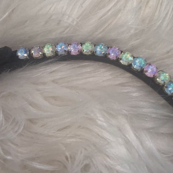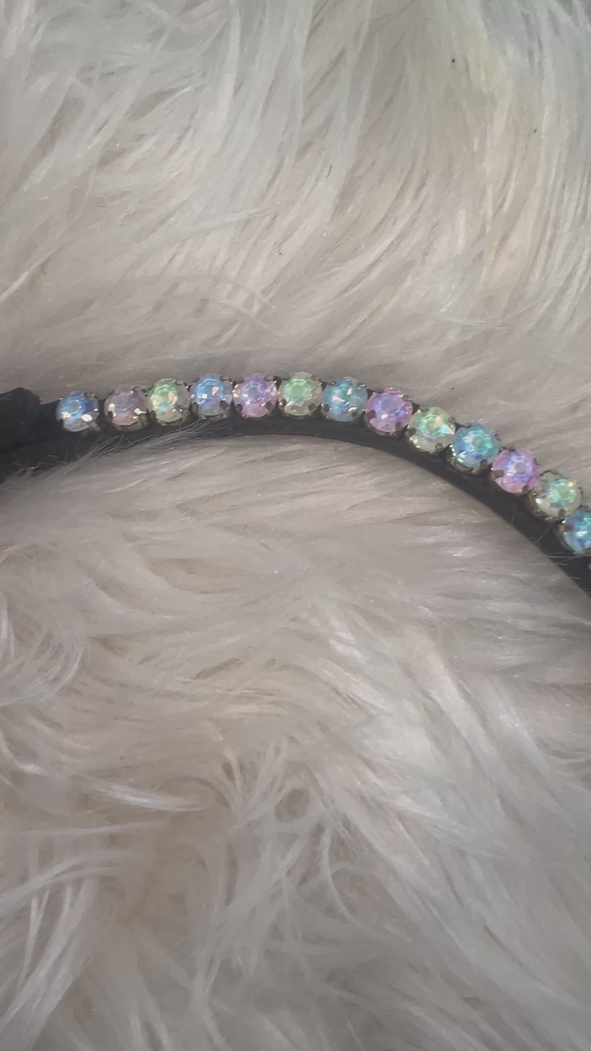 Dieser Stirnriemen setzt ein Statement. Jede einzelne Crystal-Fassung ist in Handarbeit eingesetzt und zeigt einen harmonischen Farbverlauf aus zartem Pastell – von Rosé über Opal-Gelb bis hin zu Eisblau. Das Lichtspiel der Steine erzeugt einen schimmernden Aurora-Effekt, der bei jedem Schritt deines Pferdes sichtbar wird.