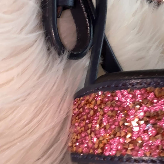 Der Nasenriemen ist mit einer intensiven Rose-Gold-Crystal-Dust-Biese veredelt. Hunderte Mini-Crystals in Pink-, Rosé- und Goldnuancen erzeugen einen tiefen, modernen Glitzer-Effekt, der perfekt mit dem blauen Leder und den roségoldenen Beschlägen harmoniert.